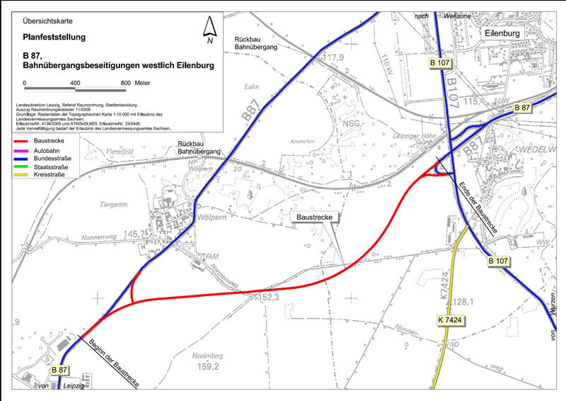 Die Landesdirektion Leipzig hat jetzt auf Antrag des Straßenbauamtes Leipzig vom 23.08.2005 den für Ende dieses Jahres angekündigten Planfeststellungsbeschluss für die Verlegung der Bundesstraße B 87 zwischen Jesewitz und Eilenburg erlassen. Damit besteht Baurecht für diese Maßnahme.
