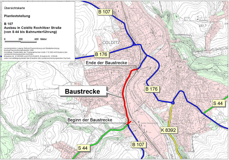 Damit kann der grundhafte Ausbau der B 107 (Rochlitzer Straße) in Colditz zwischen der Staatsstraße 44 (Geithainer Straße) und der Bahnunterführung auf einer Länge von 755 m erfolgen. Die planfestgestellte Maßnahme ist Bestandteil des Vorhabens „Ausbau der B 107 zwischen der B 176 und der S 44“ und schließt an den bereits fertig gestellten 1. Bauabschnitt „Ausbau der B 107 zwischen der B 176 und der Bahnunterführung“ an. Die Fahrbahn wird mit einer Breite von 6,50 m, bestehend aus zwei Fahrstreifen zu je 3,25 m, ausgebildet. Auf der Seite der bebauten Wohngrundstücke wird ein Gehweg angelegt, dessen Breite aufgrund der vorhandenen Bebauung bzw. Grundstücksgrenzen zwischen 1,50 und 2,25 m Breite variiert. Im Zuge der Baumaßnahme werden Ingenieurbauwerke zur Absicherung der tal- und bergseitigen Böschungen errichtet und eine funktionsfähige Oberflächenentwässerung hergestellt.
