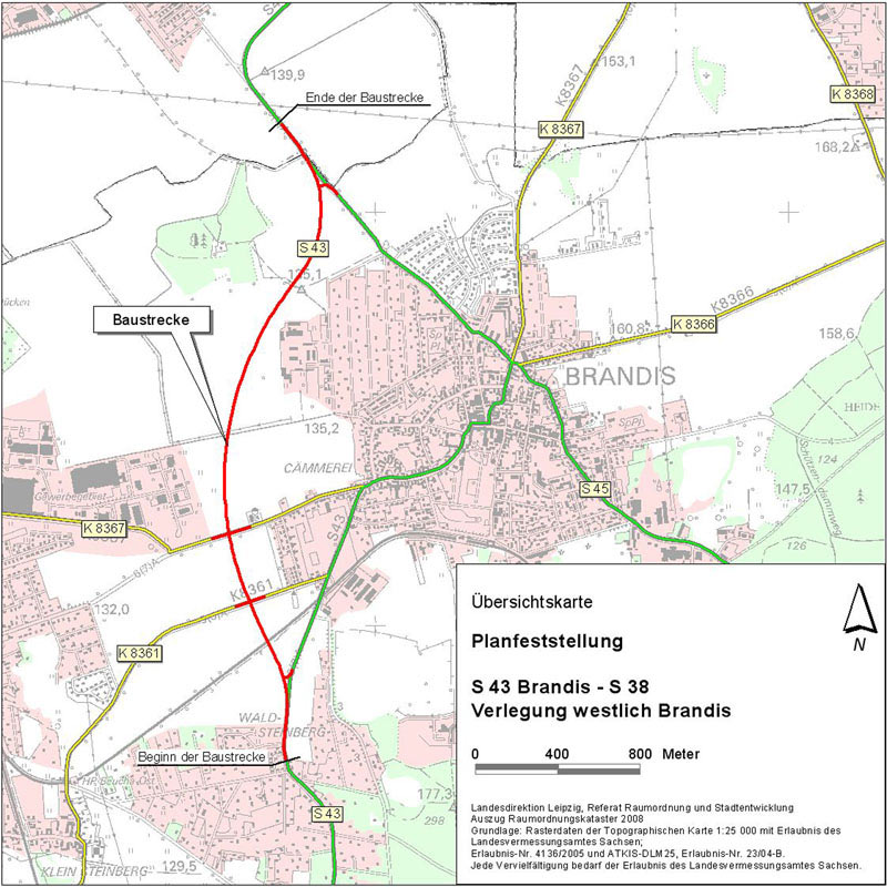 Der festgestellte Plan zur S 43 westlich Brandis wird für zwei Wochen für alle Bürger zur Einsicht in der Stadtverwaltung Brandis und in der Landesdirektion Leipzig öffentlich ausgelegt. Der genaue Auslegungszeitraum und –ort werden vorher ortsüblich bekannt gemacht. Die Einwender können den Beschluss auch schriftlich anfordern.