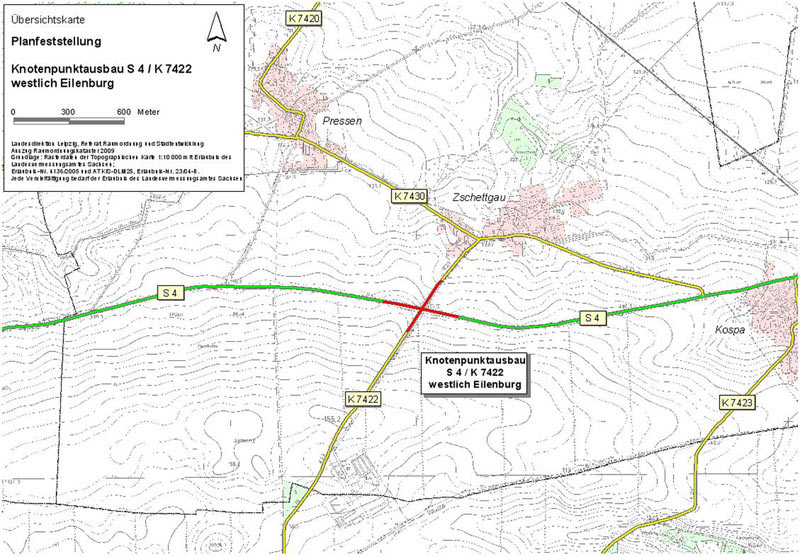 Die Landesdirektion Leipzig hat jetzt den Planfeststellungsbeschluss für den Ausbau des Knotenpunktes Staatsstraße 4/Kreisstraße 7422 erlassen. Damit wurde dem Antrag des Straßenbauamtes Leipzig von Ende März 2009 entsprochen. Diese Straßenkreuzung befindet sich südwestlich der zur Stadt Eilenburg gehörenden Ortslage Zschettgau im Landkreis Nordsachsen.
