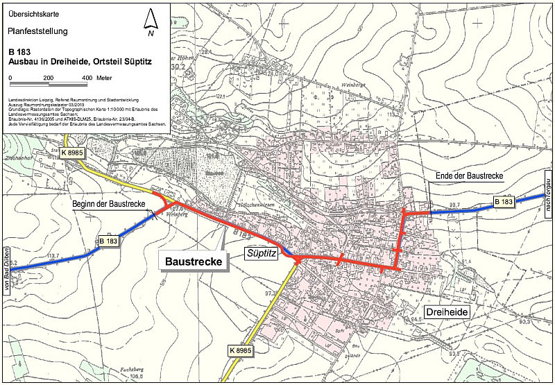 Die Landesdirektion Leipzig hat jetzt auf Antrag des Straßenbauamtes Leipzig Baurecht für den Ausbau der Bundesstraße 183 in Dreiheide, Ortsteil Süptitz geschaffen. Dieser planfestgestellte Streckenabschnitt hat eine Länge von 1.745 Metern.