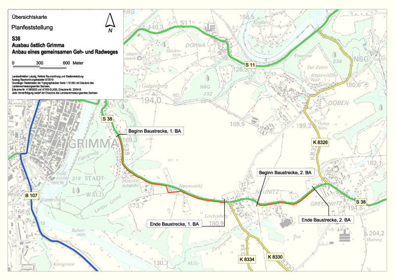Die Landesdirektion Leipzig hat jetzt den Planfeststellungsbeschluss für das Vorhaben Anbau eines gemeinsamen Geh- und Radweges an die Staatstraße S 38, Ausbau östlich Grimma, erteilt. Damit besteht Baurecht für den zweigeteilten Anbau eines überwiegend Straßen begleitenden Geh- und Radweges auf einer Länge von 2.310 Metern. Mit dem erlassenen Planfeststellungsbeschluss wurde einem Antrag des Straßenbauamtes Leipzig vom 25.05.2009 entsprochen.