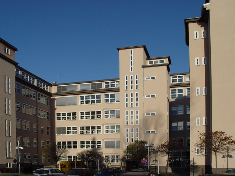 Die Architektur des Gebäudes ist wesentlich vom Bauhausstil beeinflusst. Sie kommt zum Ausdruck in der gegliederten Anordnung von 2- und 3-schiffigen Montageräumen. Das charakteristische äußere Erscheinungsbild des Gebäudes steht unter Denkmalschutz. Auf Grund des großräumigen und unregelmäßigen Industrierasters wurden vor dem Umbau zwei Probefenster gefertigt, die dem Erscheinungsbild der vorhandenen Fensterbänder entsprachen und einen Verbund von Setzholz und raumtrennenden Zwischenwänden zuließen. Am vorhandenen Außenputz wurden farbrestauratorische Bestandsuntersuchungen zur originalen Struktur und Farbgebung vorgenommen, so konnte die Fassade in ihrer ursprünglichen Erscheinung wieder hergestellt werden.